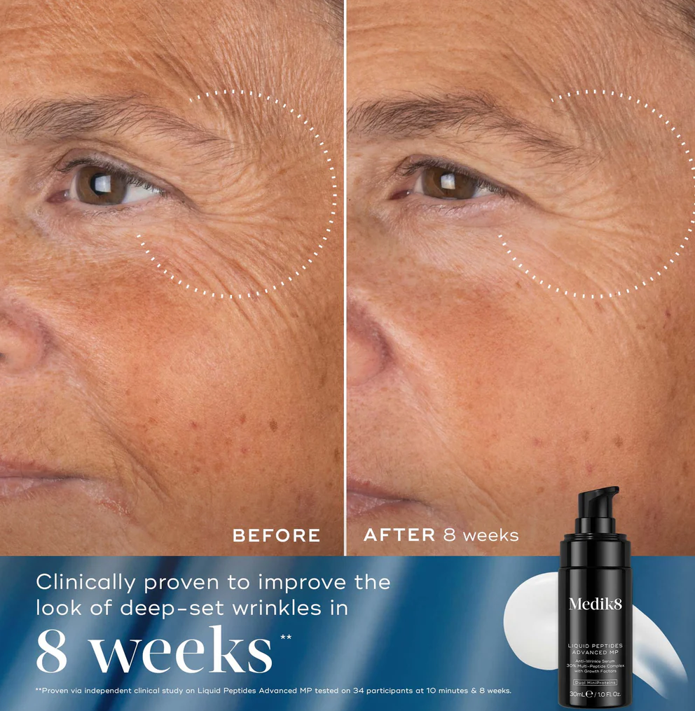 [1] Apstiprināts neatkarīgā klīniskā pētījumā ar Liquid Peptides Advanced MP, izmēģinājums veikts 34 dalībniekiem pēc 10 minūtēm un pēc 8 nedēļām.