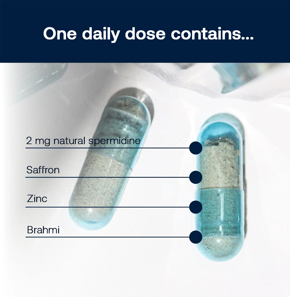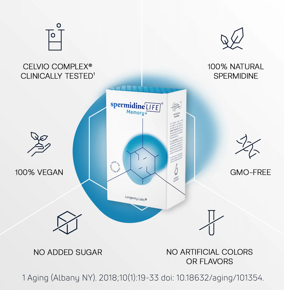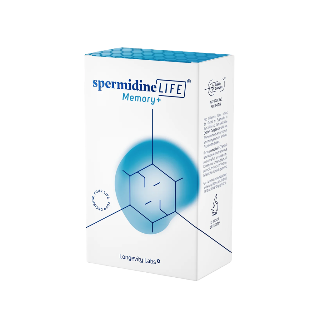 - spermidineLIFE® Memory+ tika radīts īpaši smadzeņu darbības atbalstam. Laika gaitā kognitīvās funkcijas var mainīties: var pavājināties atmiņa, kļūt grūtāk saglabāt koncentrēšanās spējas, un prāta skaidrība vairs var nebūt tāda kā iepriekš.¹ ³ ⁵